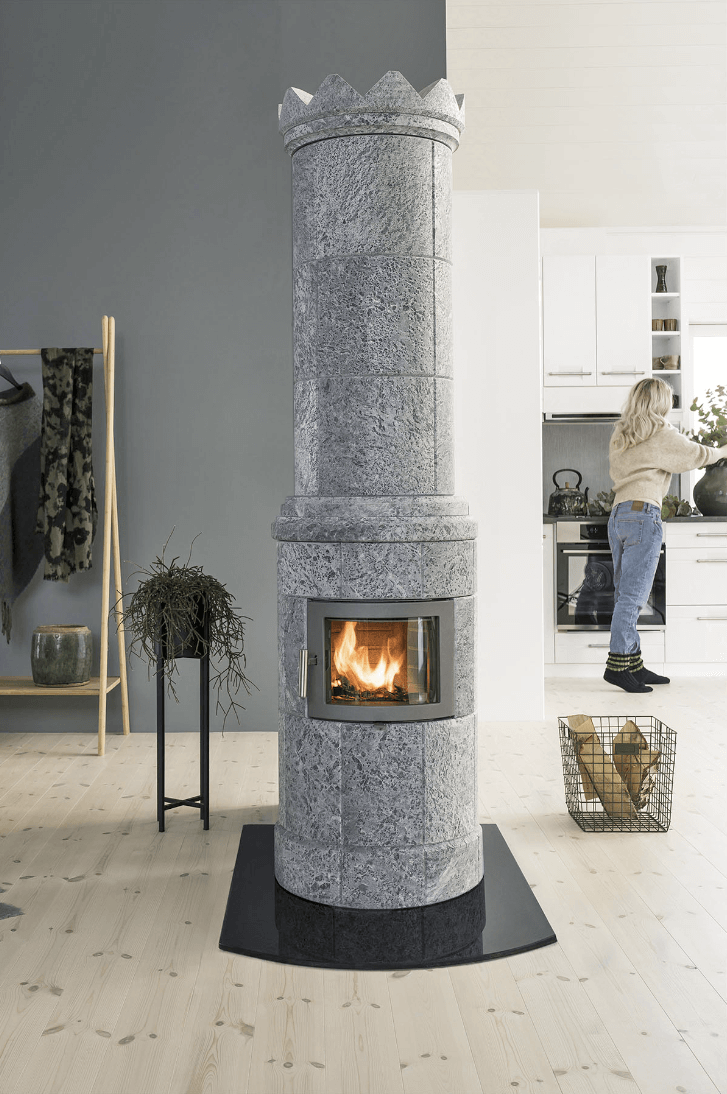 Kristin+ har en vertikal glassdør som gir et fint flammebilde. Klebersteinsovnen passer i rom med høyt til tak . Denne modellen kommer med en krone på toppen. Du kan også velge uten.
