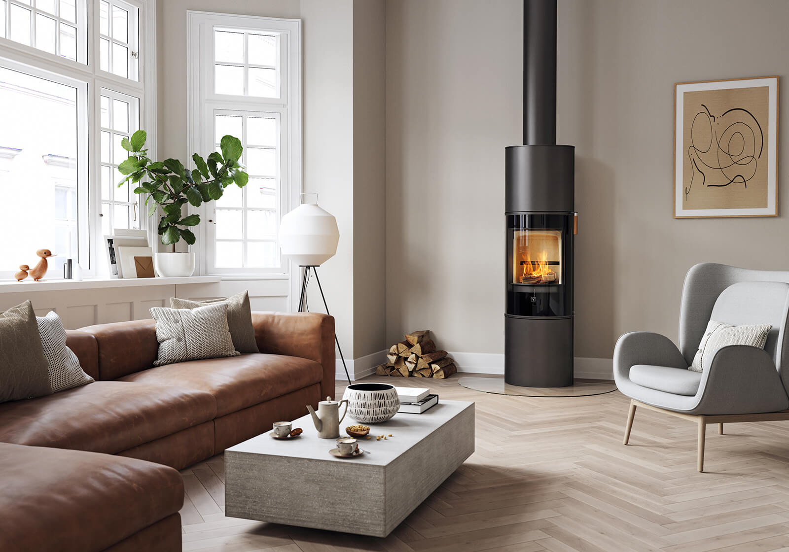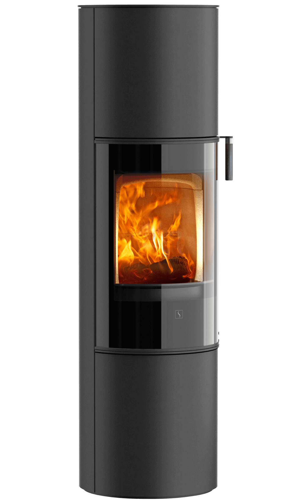Scan 84-serien har rene linjer og et nesten arkitektonisk designspråk – leken, men likevel diskret. Serien består av 4 modeller, der variasjonene ligger i valget mellom to ulike høyder; en medium eller høy variant, og dør i utsøkt sort glass eller ståloverflate. Ovnsdøren har en Soft-close funksjon som sikrer at den lukker seg mykt og stille. En dekorplate på toppen av ovnen (tilleggsutstyr) forener det røffe stålet på en vakker måte med innbydende og elegant sort glass eller kleberstein.
